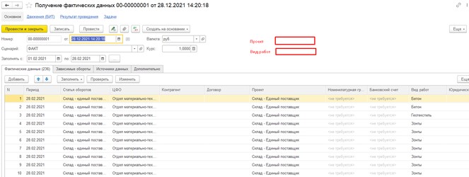 Учет затрат на материалы в группе компаний также ведется в разрезе объектов, статьей оборотов, видов работ. При этом в момент оплаты затраты определялись на единый склад, т.к. не было достоверно известно на какой именно объект пойдут материалы. Движение материалов было идентифицировано только в момент непосредственной поставки и физической передачи на объекте. Приходные и расходные документы формируются в модуле «Снабжение и склад» БИТ. Строительство. Для корректного распределения стоимости материалов, приобретенных на склад, по объектам строительства был настроен инструмент «Получение фактических данных», который собирает информацию по расходным ордерам (стоимость поставляемых материалов) и по расходным ордерам (передача материала на конкретный объект), платежам в разрезе номенклатуры. Обработка позволяет распределить затраты на материалы, приобретенных на общий склад, по объектам строительства, куда непосредственно материал был отгружен. В разработанном документе аналитику можно вести по объектам, периоду, виду работ.