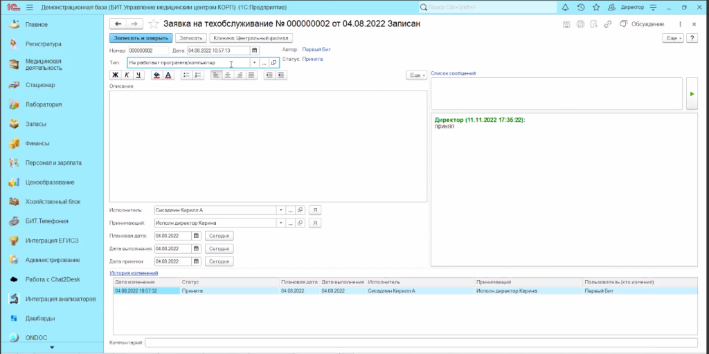 Еще на старте работы с программой «БИТ.Управление медицинским центром», у компании появилась потребность упростить взаимодействие пользователей внутри программы – врачей, операторов, ИТ-специалистов и руководителей. Необходимо было организовать простой механизм регистрации заявок с распределением ответственных и возможностью отследить их статус.