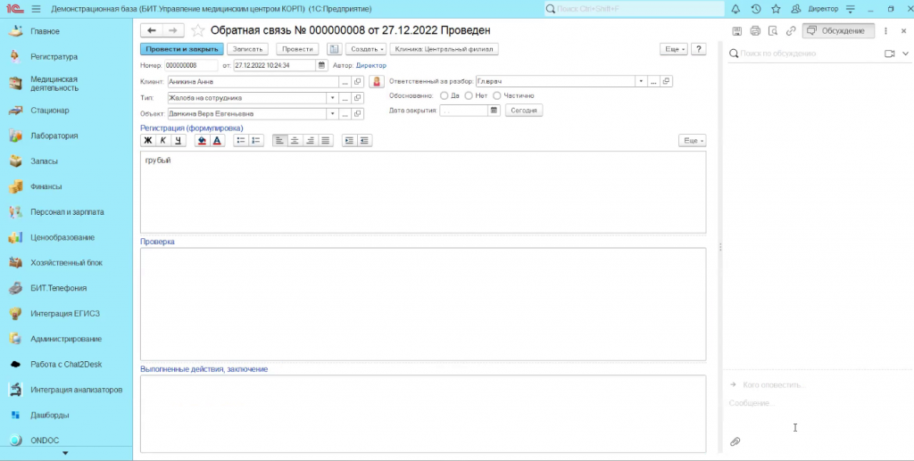 Когда оператор call-центра фиксирует жалобу, он может завести чат-обсуждение, привязанный к любому документу в «БИТ.Управление медицинским центром», в том числе к форме «Обратная связь». В чате сотрудники могут коллективно разобрать жалобу в режиме онлайн и сразу принять корректирующие действия.
