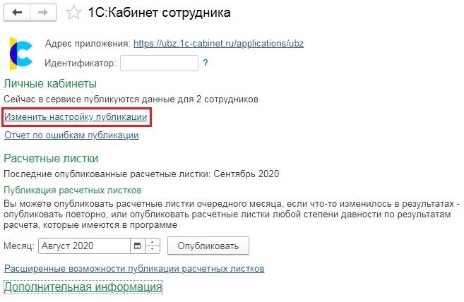 Для создания кабинета сотрудника используется кнопка «Изменить настройку публикации». Для этого пользователь заходит в меню «Кадры» или «Зарплата» и выбирает «Сервис 1С:Кабинет сотрудника».