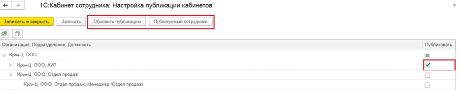 В этом окне нужно указать подразделения или должности, по которым работникам будут оформлены кабинеты. После этого потребуется нажать кнопку «Обновить публикацию».