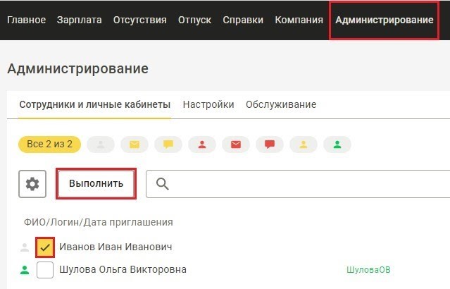 • желтая — сотрудник, которому отправили приглашение, но он еще не использовал сервис. Или же сотрудник, по которому личный кабинет создан, а потому ему можно направить приглашение.